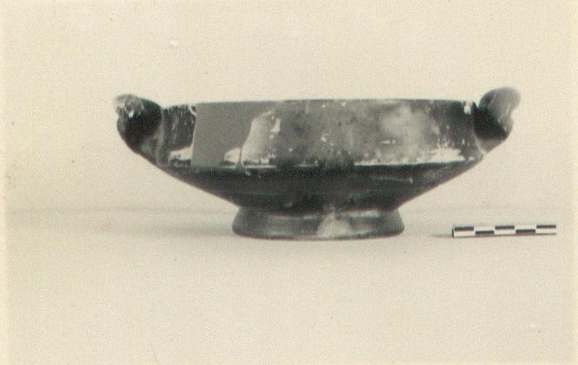 | Description: | Fragments of rim and one handle missing; restored in plaster. Deep bowl on ring foot; steeply flaring floor, joined at an acute angle to high plain slightly concave rim. Two horizontal doubled ribbon handles, rising slightly above rim. Groove around wall, outside. Red to black glaze over all. | |