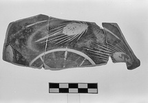 Description:   Fragment from wall only. Outside, neat wheelrun grooves. Inside, decoration in added clay: on the floor, a many-spoked wheel, its rim a scraped groove. Above, a wreath of wheat, the beards incised.