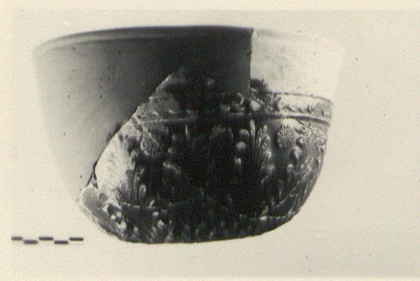 | Description: | Most of rim and much of wall missing; restored in plaster. On the bottom, gorgoneion(?); grooves and ridges around; carelessly scraped circle next to outer ridge. Above, a band of small veined leaves, rising in points six leaves high. On the wall, rising from between these points, large palmettes with dotted petals; rosettes between their tips. Above, spirals between grooves. Lip very slightly out-turned; trace of scraped groove beneath(?). Black glaze, somewhat worn. | |