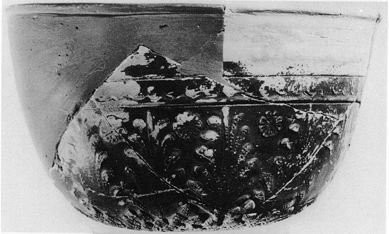 | Description: | Most of rim and much of wall missing; restored in plaster. On the bottom, gorgoneion(?); grooves and ridges around; carelessly scraped circle next to outer ridge. Above, a band of small veined leaves, rising in points six leaves high. On the wall, rising from between these points, large palmettes with dotted petals; rosettes between their tips. Above, spirals between grooves. Lip very slightly out-turned; trace of scraped groove beneath(?). Black glaze, somewhat worn. | |