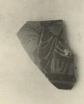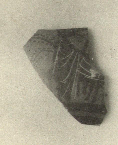Description:   Figured scene depicts flute player at foot of couch. Upper part of flute player's blobby head missing. Behind him are preserved the drawn-up knees of the figure reclining on the couch. Sparing hasty incision for interior details; no accessory color.