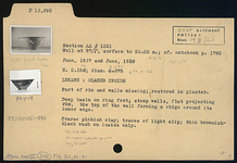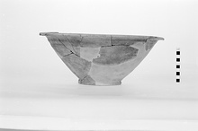 | Description: | Part of rim and walls missing; restored in plaster. Deep basin on ring foot; steep walls, flat projecting rim, the top of the wall forming a ridge around its inner edge. Coarse pinkish clay; traces of light slip; thin brownish-black wash on inside only. | |