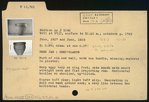 | Description: | Part of rim and wall with one handle missing; restored in plaster. Deep eggy body on ring foot; wide mouth with short straight neck and flat projecting rim. Horizontal handles on shoulder, up-tilted. Decoration in dull red wash around neck; a wavy line between two horizontal bands. Coarse buff clay; light buff slip. Ca. 7.5YR 7/4. | |