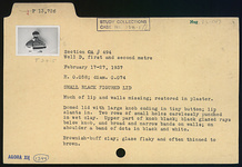 | Description: | Much of lip and walls missing; restored in plaster. Domed lid with large knob ending in tiny button; lip slants in. Two rows of small holes carelessly punched in wet clay. Upper part of knob black; black glazed rays below knob, and broad and narrow bands on walls; on shoulder a band of dots in black and white. Brownish-buff clay; glaze flaky and often thinned to brown. | |