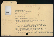 | Description: | Fragment from shoulder of closed pot (oinochoe?); part of lead clamp between the figures. Left, a woman's head, left, her hand raised in front of her; at right, the head of a man, also to left, at slightly lower level. White for woman's face and hand; purple for her dress, the iris of her eye and for the fillets of both figures; incision for many interior details. Fine pinkish-buff clay; good black glaze; inside unglazed. | |