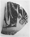 | Description: | From the wall of an amphora or other closed pot. Preserved is lower part, from hips down, of a draped male figure standing left, leaning on a staff. At left, a bit of drapery of a second figure(?); at right, palmette. Below, a band of linked lotus buds. Purple for two bands on folds of garment. Incision for some outlines, some inner details. Dark pinkish-buff clay, fair black glaze. | |