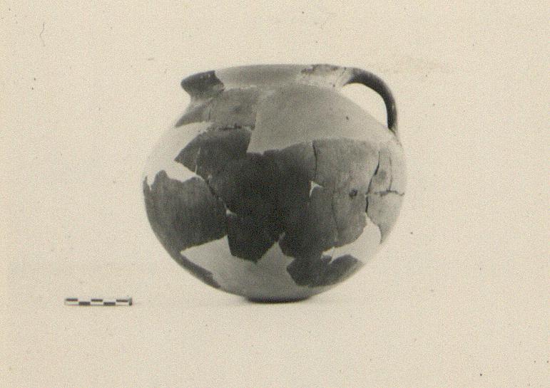 Description:   Much of walls and bits of rim missing; restored in plaster. Round-bottomed and round-bodied; wide mouth with low flaring rim; single short band handle, shoulder to lip. Lower wall outside pared vertically.