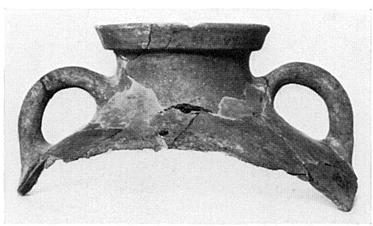 | Description: | Mouth, neck and handles with a little of shoulder preserved; strengthened with plaster. Short handles, shoulder to base of neck. Short neck; heavy flaring collar rim; two light grooves around outer face; inner face concave (for lid?). Brown clay with much grit and mica. Handmade. | |