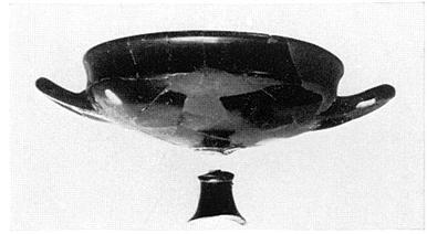 | Description: | Many wall fragments, part of rim and of one handle missing; restored in plaster without stem. One of the handles and the stem were broken in antiquity and mended with lead rivets. A purple band, set off by an incised line, around top of stem. b) From the stem of a similar but not the same cup, mended in the same way in antiquity. Moulded ring around top of stem, purple, set off by two incised lines. Excellent glaze. | |