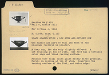 | Description: | One handle and part of wall and much of rim missing; restored in plaster. A deep cup, the rim only slightly offset. A low moulding at top of stem. The foot has a bevelled outer edge and broad resting surface. Purple on moulding at top of stem. Reserved: the bearing surface of the foot, and outer edge. Pinkish-buff clay; black glaze mostly fired greenish. Note wear at two sides of foot and at corresponding points on wall and lip. | |