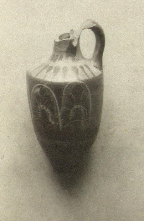 | Description: | Lip and foot missing. Decoration as on P 1381, but the glaze somewhat better preserved. ADDENDA P 1381: Four large palmettes on front of body not centerd to handle; on the shoulder degenerate lotus pattern; short strokes around the base of the neck. | |