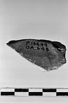 | Description: | Fragment from the lower right corner. Glaze band along side and bottom of face; above the band, at the bottom, a border of large irregular ovals, in thin glaze. Above, on a thin ground line, part of a figured scene: a draped figure (lower part only preserved) seated left on a stool with elaborately turned legs. In front of this figure, a thin line, curving slightly from the vertical (staff?). Beyond, to left, trace of another figure(?). Fine deep pinkish-buff clay; back and edges plain. Added purple on the cloak; careless incision for many details. | |