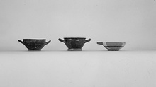 | Description: | Mended from eight pieces; less than one-quarter of the rim preserved and more than half of the base ring. Traces of one handle attachment; handle appears to have been glazed. Inside black glazed save for reserved center with glazed circle; top of lip glazed. Outside banded, resting surface and underside within ring foot not glazed. Upper part of outside covered with dilute glaze wash. (Cf. Type II lamps.) Cf. Agora XII, no. 737. | |
