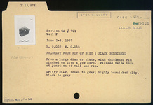 | Description: | From a large dish or plate, with thickened rim pinched up into a low horn. Pierced below horn at junction of wall and rim. Gritty clay, brown to gray; highly burnished slip, black to gray. | |