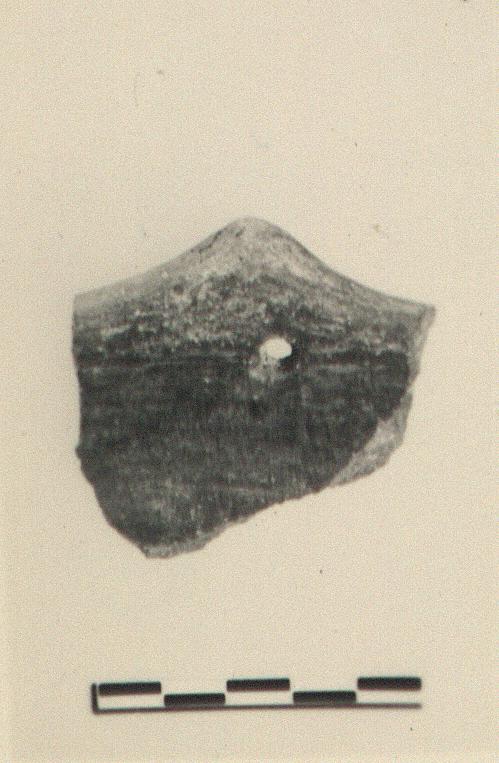 | Description: | From a large dish or plate, with thickened rim pinched up into a low horn. Pierced below horn at junction of wall and rim. Gritty clay, brown to gray; highly burnished slip, black to gray. | |
