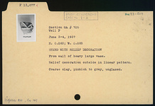 | Description: | From the wall of a large heavy vase. Relief decoration outside in linear pattern. Coarse clay, pinkish to gray, unglazed. | |