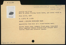 | Description: | Apparently from the wall of a round-bodied bowl. Gritty brown clay, largely fired gray; burnished slip, eggplant purple outside with striped decoration; black and inferior inside. | |