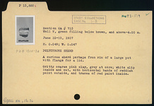 | Description: | A curious fragment perhaps from rim of a large pot with flange for a lid. Gritty coarse pink clay, gray at core; white slip inside and out, with horizontal bands of reddish paint outside, and traces of red paint inside. | |