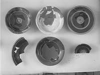 | Description: | Six joining fragments preserve more than one-quarter of the rim circumference and less than a quarter of the low base ring (which is divided nearly into two by a deep groove through its center. Outside, s-curved; inside, flat bottom from which the flaring rim is offset. Near the edge of the rim, two holes for suspension. The outside unglazed, polished; the inside glazed, grayed in firing. Two reserved bands on the rim, the outer one in a shallow wheel-run groove and a third, narrower, at the junction of rim and center. Cf. Agora XII, no. 1003. | |