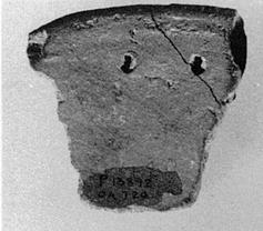 | Description: | From the rim of a very shallow plate with plain rim. Near the rim as preserved two (and part of a third) string holes. That the inside is smoothed and not the outside suggests that this is part of a dish rather than a lid. Coarse brownish gritty clay. | |