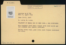 | Description: | Rim fragment from small vessel with wide mouth and low rounded rim, nearly vertical. Gritty brown clay, gray core; much flaked burnished red slip. | |