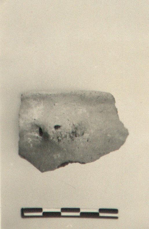 | Description: | Fragment from rim and shoulder. Low slightly flaring rim, well marked off from shoulder; horizontally pierced lug at shoulder. Gritty brown clay; red slip inside and out, probably originally burnished. | |