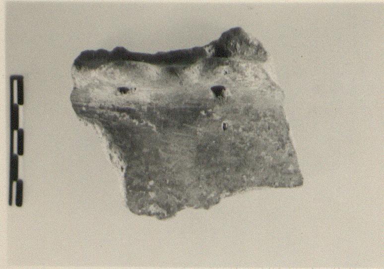 | Description: | From wall of a large closed(?) pot, preserving all but the extremities of the ledge handle, doubly pierced. Gritty brownish clay, graying toward core and outer surface; traces of reddish slip outside (originally burnished?). | |