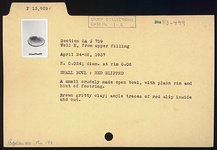 | Description: | A small crudely made open bowl with plain rim and hint of foot ring. Gritty brown clay; ample traces of red slip inside and out. | |
