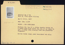 | Description: | Perhaps the top of a ribbon handle rising to a sharp apex high above the rim of an (open?) pot, a large chip missing from the preserved fragment. Gritty brown clay; good burnished red slip. | |