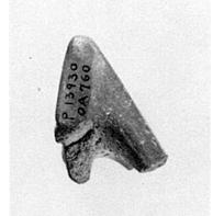 | Description: | Perhaps the top of a ribbon handle rising to a sharp apex high above the rim of an (open?) pot, a large chip missing from the preserved fragment. Gritty brown clay; good burnished red slip. | |