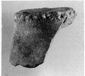 | Description: | Nearly half of wall of high slightly flaring foot or stand, and whole circle of bottom of pot preserved. Gritty reddish-brown clay, gray core; surface mottled in firing. | |