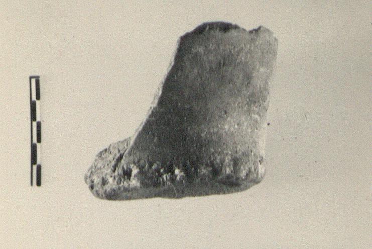 | Description: | Nearly half of wall of high slightly flaring foot or stand, and whole circle of bottom of pot preserved. Gritty reddish-brown clay, gray core; surface mottled in firing. | |