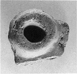 Description:   A squat knob with a cup-like hollow in it projects from the wall(?) of a vessel which, so far as preserved, is quite flat. The back is very worn and rough.