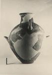 | Description: | Many fragments, including one horizontal handle missing; restored in plaster. Flat small bottom; ovoid body; concave profile for neck with plain splayed lip. Two large lug handles, pierced at midline; two vertical handles, round in section, on shoulder. Decorated in white with bars on inside of lip, a band around top of neck and one at junction of neck and shoulder from which depend large hanging triangles. Gritty clay, red to brown; unglazed. | |