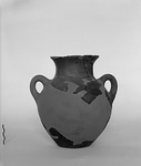 | Description: | Very fragmentary but profile complete. Flat bottom; ovoid body; wide neck with plain splayed lip. Restored in plaster. One arched handle is preserved, round in section, high on shoulder. Gritty micaceous clay, red to brown, gray at core. Traces of light on dark decoration on neck and shoulder. | |