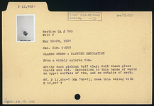 | Description: | From a widely splayed rim. Gritty dark pinkish-buff clay; dull black glaze inside and out. Decoration in thin bands of white on upper surface of rim, and on outside of neck. Cf. P 13956 and P 13957. Does this belong with P 13957? | |