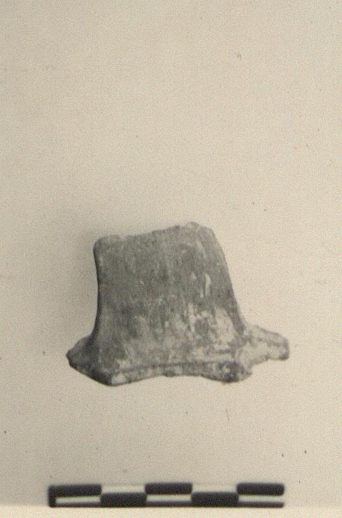 | Description: | Lower end and attachment of a wide thin ribbon handle. Clay gray to beige with some grit; gray technical slip inside and out, fairly lustrous inside. | |