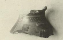 | Description: | A bit of the trefoil lip is preserved and the full width of the panel at the top showing youth and maenad. Incision for interior details very scanty and careless. Added white of which now little but the stain remains for the girl's flesh, for dots on her garment and for a fillet(?) across the youth's brow. Red, now represented by a brownish stain, for more dots and for the girl's fillet. Joins with P 1558. | |
