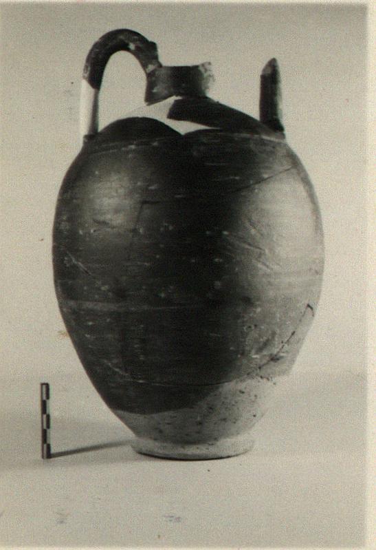 Description:   Mouth, much of neck and handles, and fragments of body missing; restored in plaster. Shape similar to P 14023 (Φ 657), but more elongated. Pair of grooves around shoulder, and at base of neck.