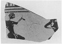 | Description: | Broken all around. Parts of two dancing figures, the left-hand one a man; red for his hair. Above, three narrow glazed bands and part of a zone of tongues, alternately red and black. Black glaze on interior. | |