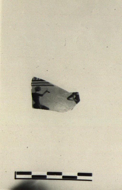 | Description: | Broken all around. Parts of two dancing figures, the left-hand one a man; red for his hair. Above, three narrow glazed bands and part of a zone of tongues, alternately red and black. Black glaze on interior. | |