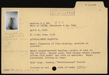 | Description: | Small fragments of body missing; restored in plaster. Body widens toward rounded bottom with knob; narrow neck; small single-grooved handles, from middle of neck to top of wall. Air hole in shoulder. Light horizontal ribbing on body. Incised on one side of neck: <graphic> Buff clay. Greasy, "Justinianian" finish. ADDENDA Top part broken off (1951) and mended (by Nov. 1956). | |
