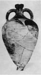 | Description: | Toe and fragments of body missing; restored in plaster. Egg-shaped body tapering downward toward pointed toe; narrow neck; broad collared lip; sharp-edged handles, with a deep groove down their centers, from neck. Brownish clay. Unglazed. | |