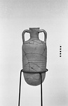 Description:   Fragments of body missing; restored in plaster. Rounded bottom; more or less cylindrical body with irregular horizontal ribbing; rolled lip; roughly ridged handles from below lip.