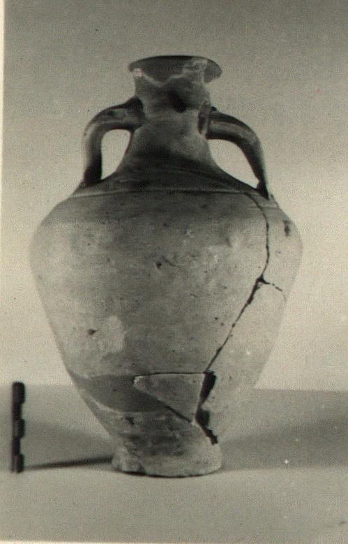 | Description: | Fragments of one handle, lip and body missing; restored in plaster; minor chips. Ring foot; egg-shaped body; small out-turned lip; short band handles from a low handle ridge. Broad groove on shoulder. Very heavy fabric. Whitish-buff clay with particles; pinkish-orange at surface (slip?). | |
