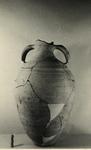 | Description: | Mouth and fragments of body missing; body restored in plaster. Small flat bottom; egg-shaped body; sloping ridged handles from neck. Incised on shoulder: <graphic> Gritty buff clay. Light buff slip. | |