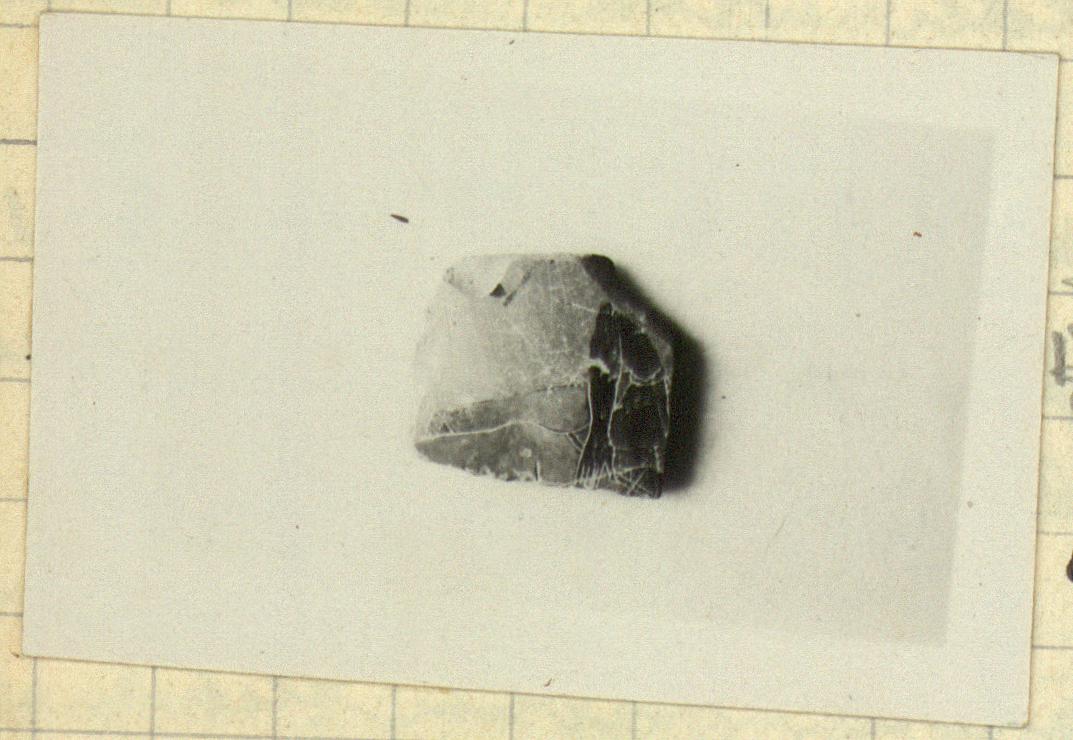 | Description: | From wall of a large open vase; black glazed inside. Head, leg, and left side of figure missing; right arm bent at elbow. Figure wears close-fitting black jerkin over which is a purple himation with ornamental border. Careful incision for detail. | |