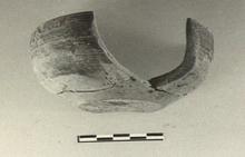 | Description: | Full profile preserved; about half of side missing. Hemispherical bowl with flat bottom and plain lip. Light brown clay. Inside and upper part of outside covered with thin dark brown glaze, worn. Possibly non-Attic. | |