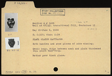 | Description: | Both handles and some pieces of side missing. Ovoid body; ridge between neck and plain thickened lip; plain base ring. Rather poor black glaze. | |