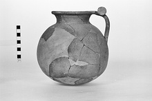 | Description: | Restored in plaster. Plump body; round bottom; short neck; flaring rim with groove on top to receive lid; double handle with rotelle. Carefully made of gritty red clay. | |